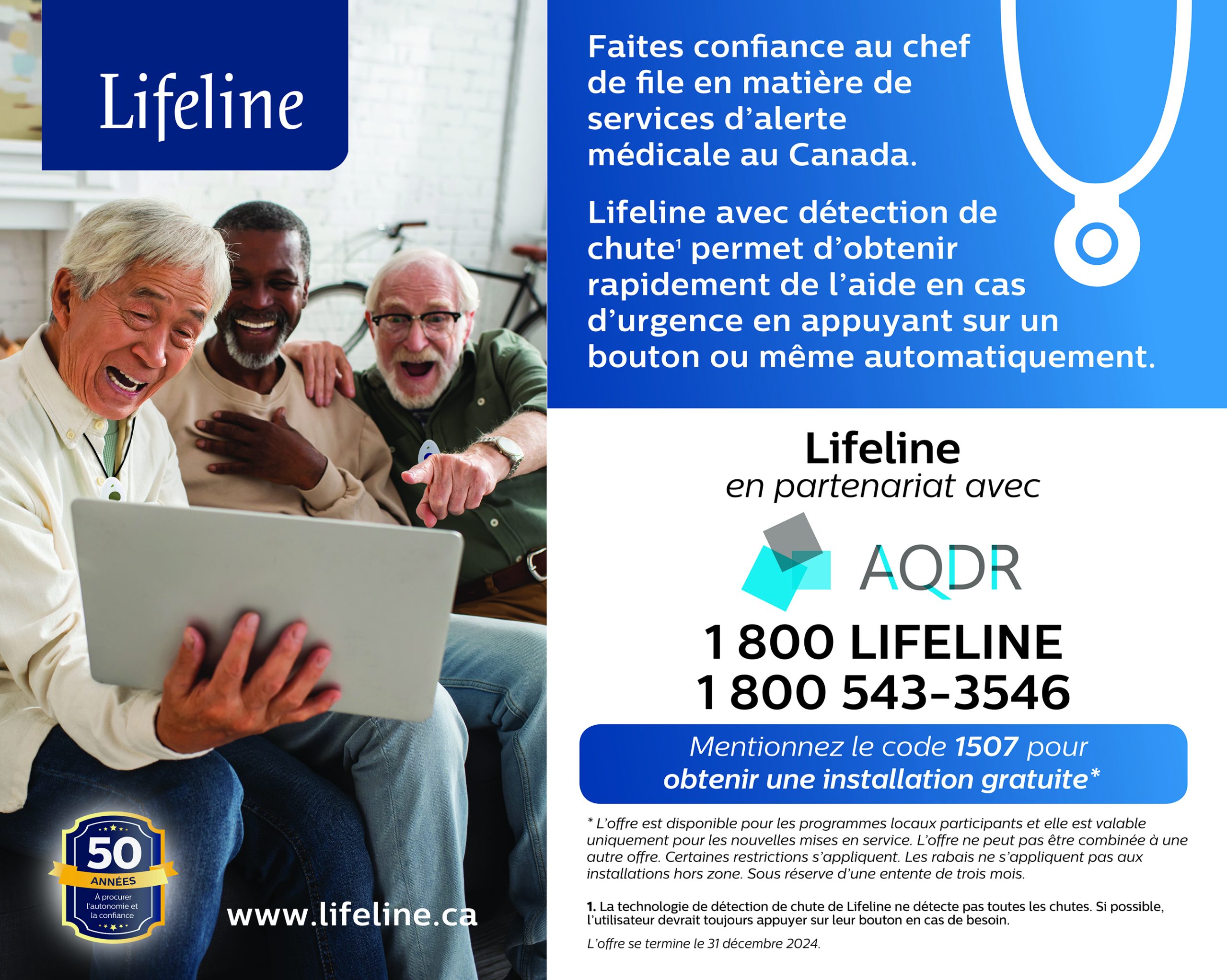 L’AQDR est fière de vous présenter un nouveau partenaire qui offrira un nouvel avantage à nos membres. Celui-ci pourra soit leur profiter directement, ou encore, à une personne de leur famille. Voici un extrait de leur site Web, qui décrit succinctement leur service. « Le service d’alerte médicale le plus fiable au Canada Plus de 7 millions de personnes ont fait confiance à Lifeline pour se sentir en sécurité à la maison. Facile d’utilisation, Lifeline est un service d’alerte médicale qui vous permet de demander de l’aide en tout temps, jour et nuit, même si vous n’arrivez pas à parler. Il suffit d’appuyer sur votre bouton d’aide, que vous portez sur un bracelet ou un pendentif; un télésurveillant qualifié s’assurera ensuite que vous recevez de l’aide rapidement. C’est pour cette raison que le service d’alerte médicale de Lifeline se classe au premier rang. En outre, il vous offre quelque chose de primordial : la tranquillité d’esprit. » https://www.lifeline.ca/fr/