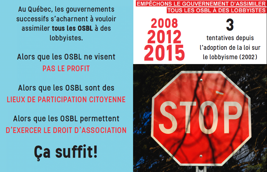 Depuis 2002, les OSBL du Québec ont dû se défendre contre trois tentatives pour les assimiler à des lobbyistes. Puisque rien n’annonce encore la fin de ces tentatives, les actions de la campagne «Mon OSBL n’est pas un lobby» doivent se poursuivre.